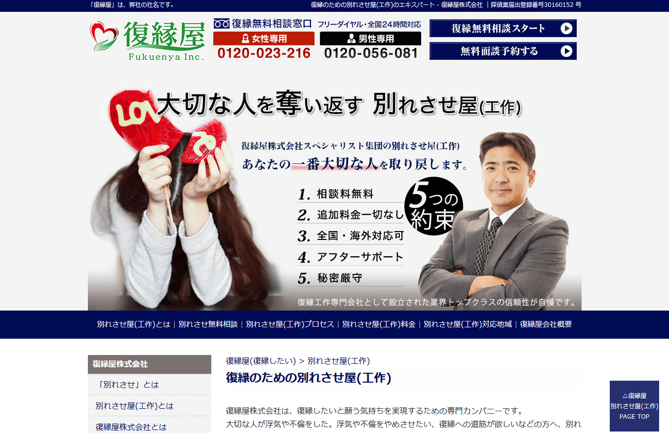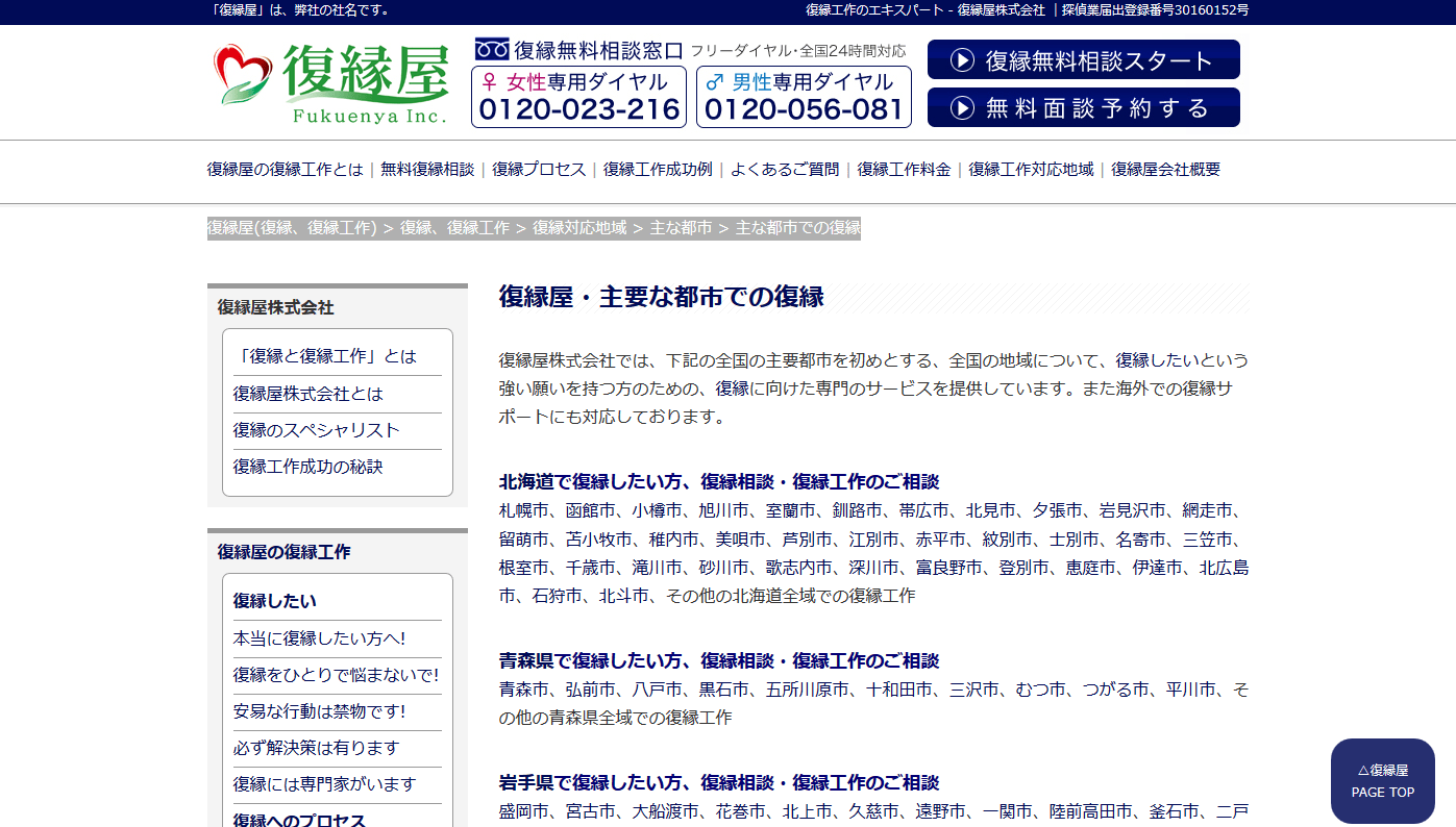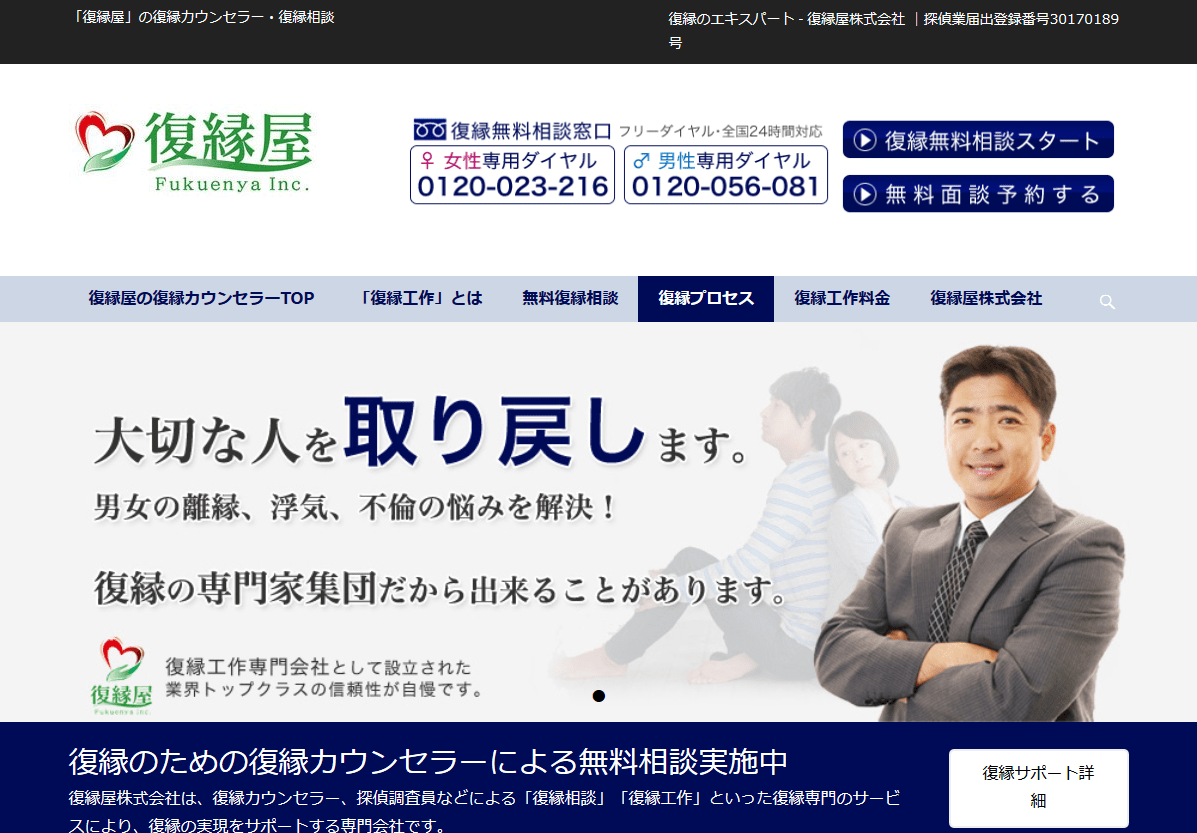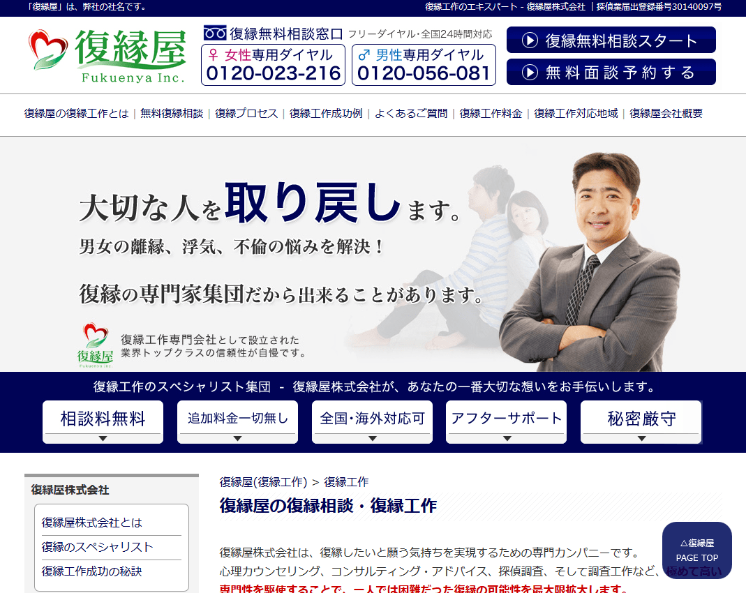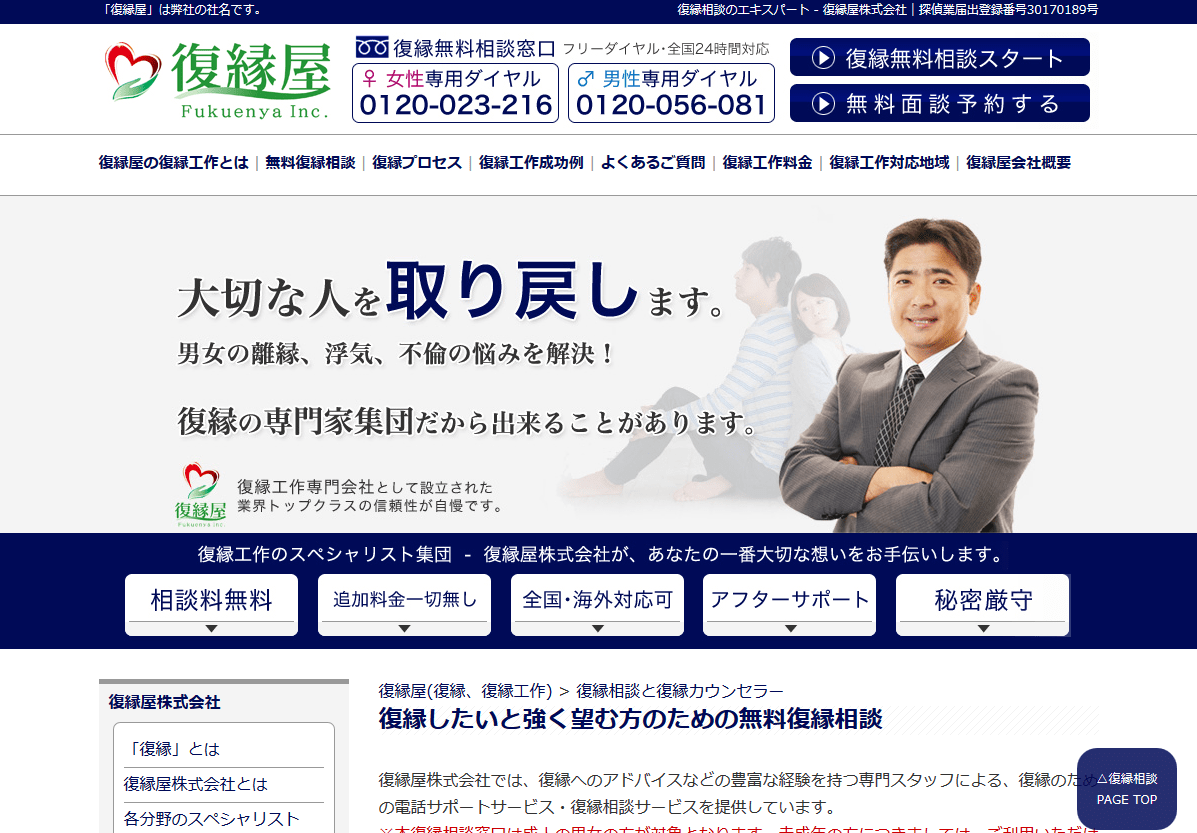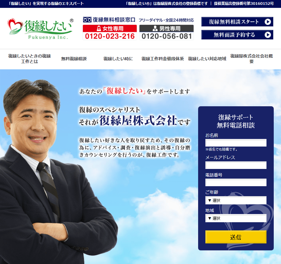 復縁屋の復縁カウンセラーによる復縁工作・無料復縁相談窓口フリーダイヤル・全国24時間対応 復縁したい方への女性専用ダイアル0120-023-216復縁屋の復縁カウンセラーによる復縁工作・復縁無料相談窓口フリーダイヤル・全国24時間対応 復縁したい方への男性専用ダイアル0120-056-081復縁屋の復縁カウンセラーによる復縁相談、復縁面談、復縁工作・無料復縁相談スタート(問い合わせフォーム)